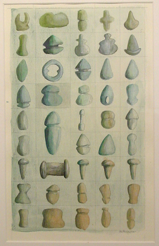 Dr. Walter Affolter starb 1982 nach längerer Geisteskrankheit in der Heil- und Pflegeanstalt Altenberg BL. Seine Collagen und pseudo-wissenschaftlichen Zeichnungen aus dieser Zeit inspirieren noch heute viele junge Künstler fast ebenso wie die Blauköpfe von HABALUKKE. Affolter verfiel zusehends dem Wahn, eine hellseherische Gabe zu haben. Er behauptete, er könne archäologische Funde vorhersagen. Er habe Eingebungen, welche er zu Papier bringen müsse, damit man ihm glaube, wenn diese Dinge dann auch gefunden würden. Auf einer Karte bestimmte er, wo die Artefakte zu suchen seien. Ihm zu Ehren wurde in der Tat eine Grabung durchgeführt, welche zum Leidwesen aller Esoteriker erfolglos war. Die seriellen Arbeiten (Idole, Picrolite wie er sie nannte) waren seiner Zeit voraus.