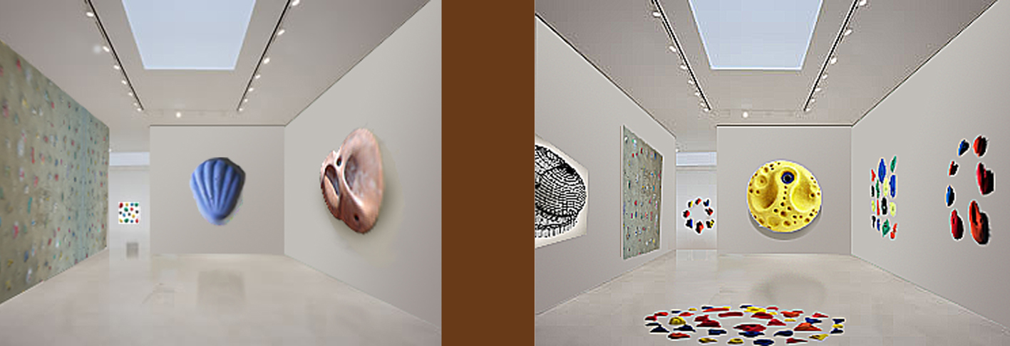 Irgendwie ist es doch erstaunlich, dass Schär es immer wieder fertig bringt, seine eigene Zunft zu provozieren. Beim Betreten der Galerie assoziert man sofort mit dem frühen Cragg und mit Richard Long. Schär darauf angesprochen, wie immer unverblümt : "Die Typen kenne ich nicht, was machen die?" Und ehe man antworten kann: "Ich bin froh, dass ich kein einziges Werk selber gemacht habe. Das Zeug kann man alles kaufen und anfertigen lassen. - Gut die Photos von Esterházy 1-10, die als Vorlage für die Nachbildungen dienten, ok ja, aber das war nur Geknipse." Teures Geknipse, das Blatt zu 3500.- HUS. Im elegant aufgezogenen Katalog wird man dann schnell fündig. Der Flakturm im Esterházypark Wien ist Ausgangspunkt der Skulpturenschau (oder besser Show). Am alten Flakturm befindet sich ein Kletterpark. Der Betonbau eignet sich hervorragend für die Befestigung (Dübel) der sogenannten Klettergriffe. Schär: "Geben Sie in Google das Wort Klettergriffe ein, und Sie werden sich wundern ab so viel Schönheit." Aber noch schöner sei die Installation am Flakturm selber, die leider nicht von ihm stamme. Seine Appropriation sei nur die Transformation des pragmatisch Gewachsenen hinüber in die Kunst. Der Klettergriff sei an sich schon ästhetisch angedacht durch den Klettergriffdesigner. Er habe sich im Fundus der Klettergriffvielfalt lediglich bedient und einige besonders schöne Exemplare etwas "aufgeblasen". Dank seines Bekanntheitsgrades sei die Herstellung von Kunst für ihn ein Kinderspiel. Zum Titel der Werkgruppe: "Esterházy klingt gut und der Turm ist ein geiles Stück Beton. " Schär darauf angesprochen, ob die Photoarbeit Flakturm nicht ein wenig ausehe wie ein Werk von Bernd und Hilla Becher? Schär: Flakturm ist Flakturm, Becher hin oder her.- Interessant sind die Mutiples von Schär. Zu haben ist ein Bausatz mit den Klettergriffen, Schrauben, Dübel und einer von Schär signierten Schablone, zur richtigen Befestigung der Griffe. Die Schablone aus Kunsstoff ist mit einem Betonwandaufdruck (Foto Kletterwand Flakturm-Estrerházy) versehen. Auflage 100 Exemplare exklusiv bei Bertram und Söhne.