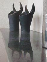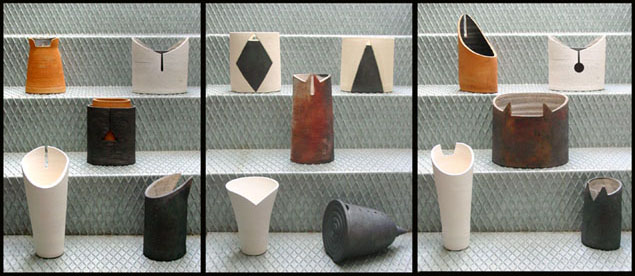 in der tat bin ich keine freundin von glasuren. ich mag die natürlichen oberflächen der verschiedenen tonarten. ich mag die oberflächenbearbeitung mit feuer und rauch. ich mag gewisse engoben, ich mag auch den seidenglanz von sinterengoben. ich kann oder muss da mit glasuren leben, wo es um die wasserundurchlässigkeit geht, meist jedoch im gefässinneren. ich gehöre zu denen, die sichtbeton in der architektur schön finden, sofern die schalung sauber ausgeführt wurde. für mich ist die textur eines gefässes sehr wichtig, ich zeige auch bewusst montageübergänge. ich kann aber durchaus gummi, metall oder glas in einen gegenstand integrieren, wenn es mir sinnvoll erscheint. ich lege mich nicht puristisch auf die keramik fest.